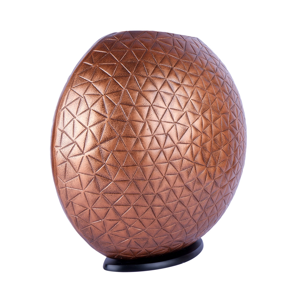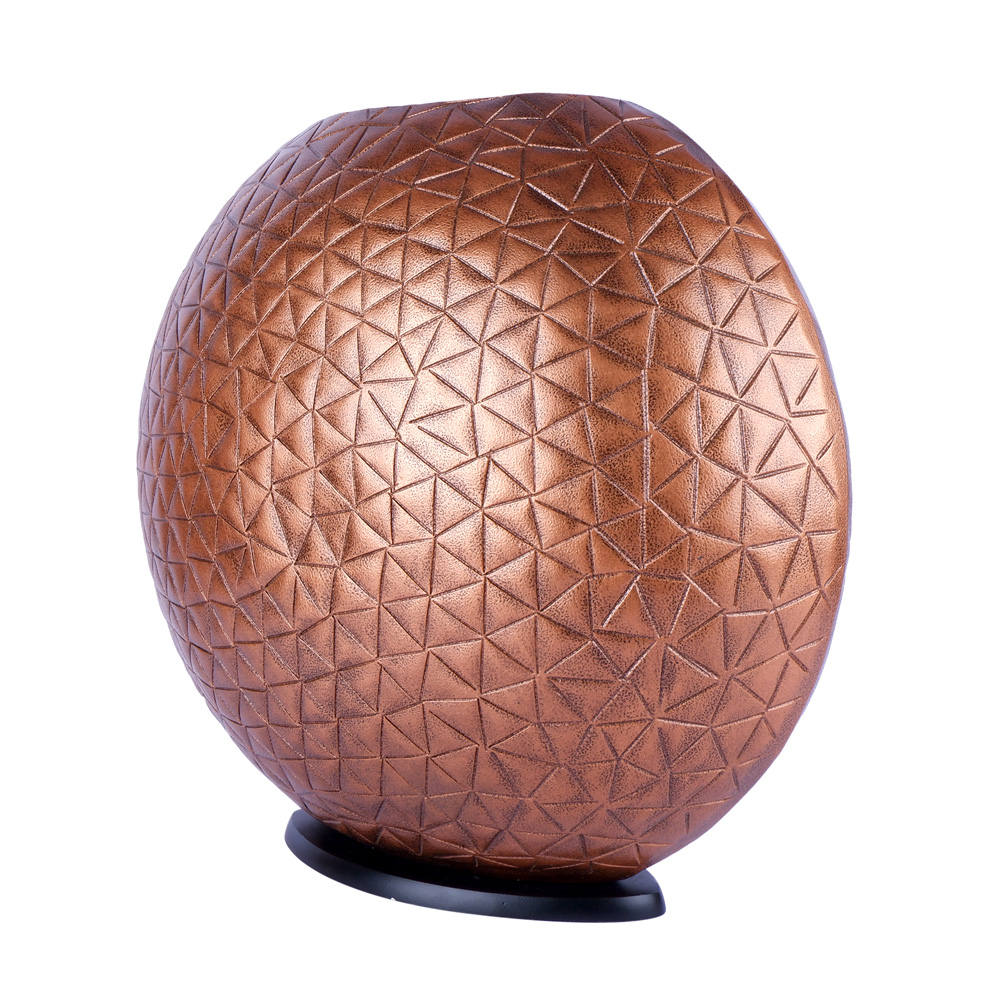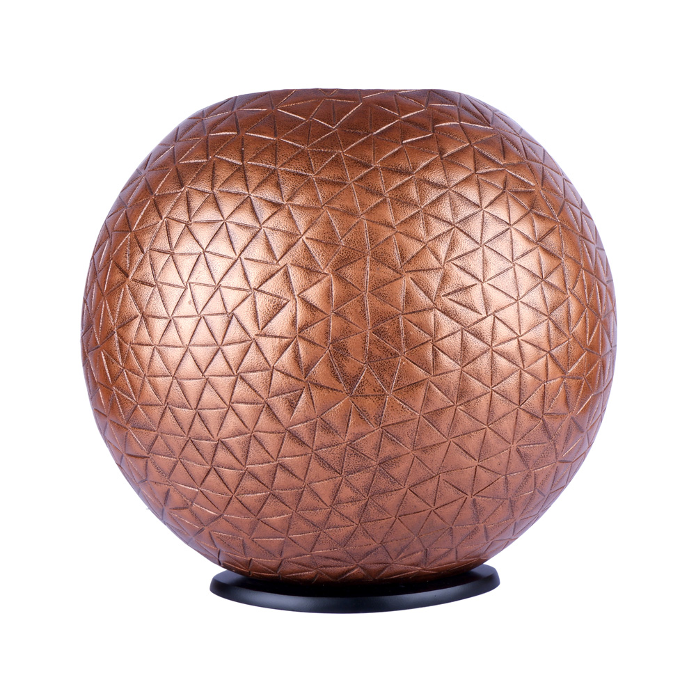 This eye-catching spherical vase boasts a rich, warm copper-toned finish, creating a luxurious and inviting presence. Its most striking feature is the intricate geometric pattern that completely covers its surface. This textured design, resembling faceted triangles or a quilted effect, creates dynamic shadows and highlights, giving the vase a multidimensional and contemporary appeal. The vase rests on a sleek, discreet black circular base, which provides stability and a modern contrast to the metallic body. Perfect as a standalone sculptural object, or for holding dried botanicals, pampas grass, or artificial arrangements.