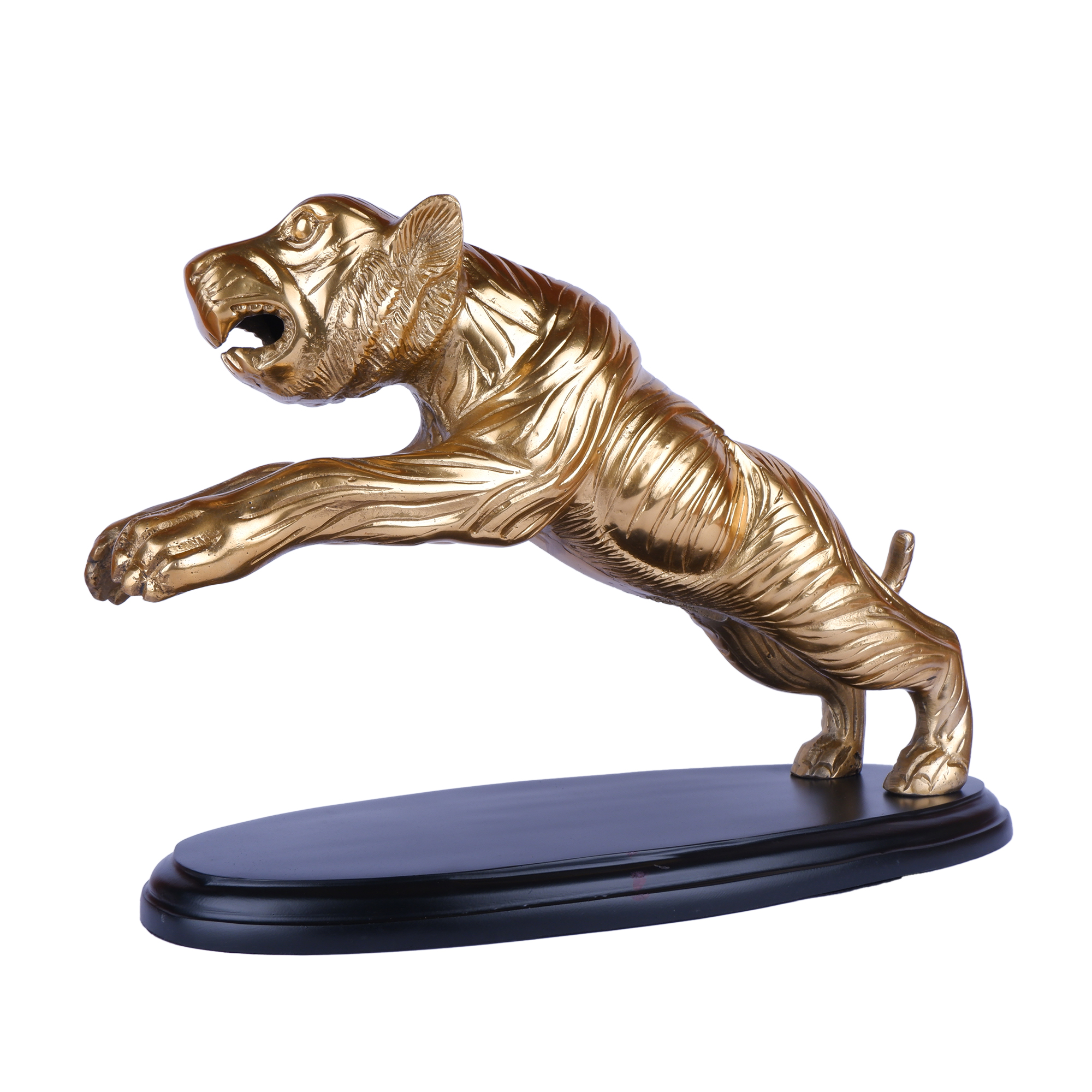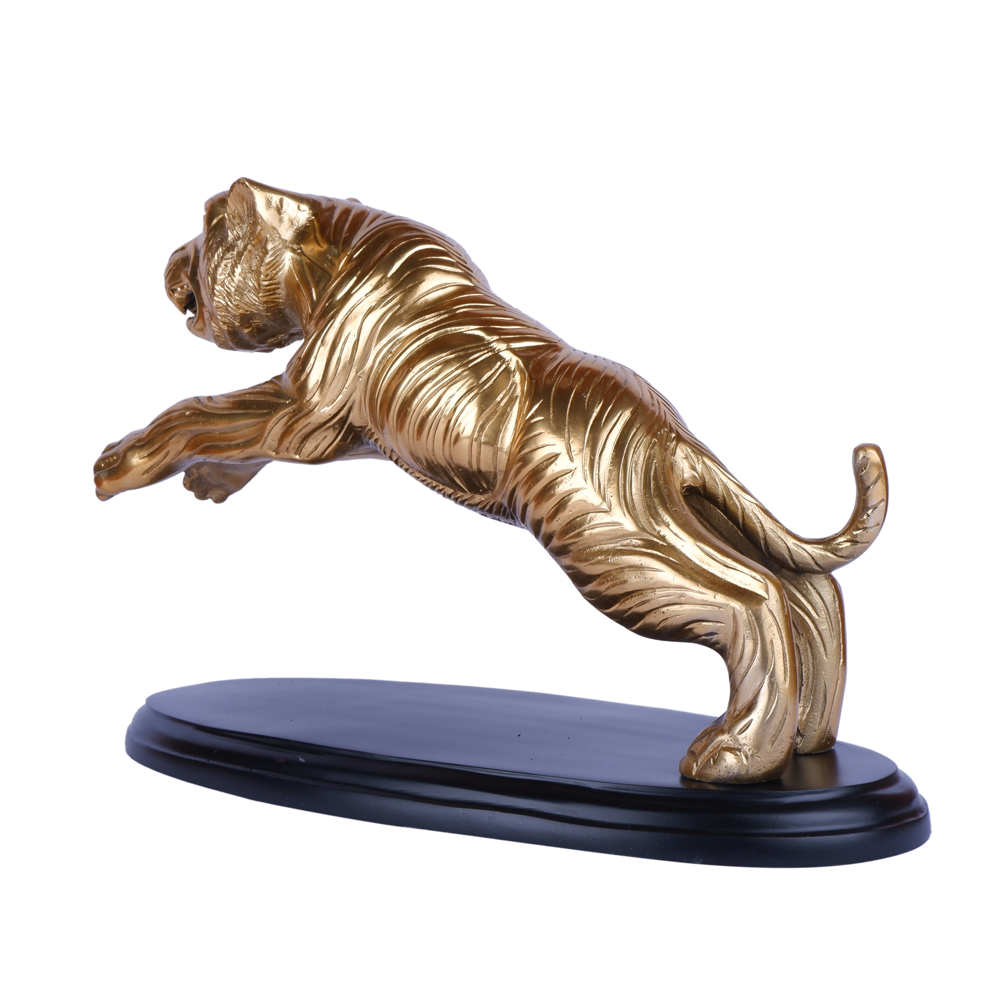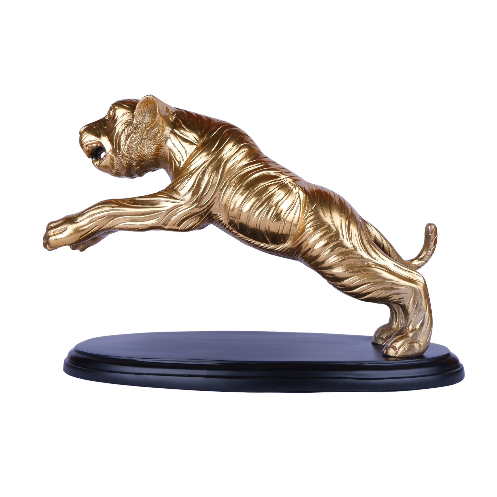 A majestic gold leaping tiger statue on a sleek black base, symbolizing strength, courage, and determination—perfect for desks, décor, or gifting.