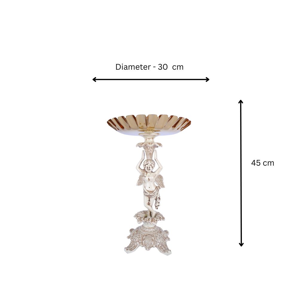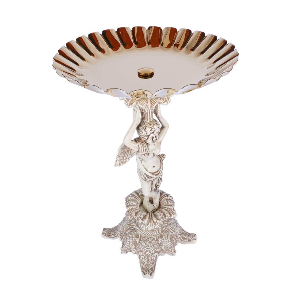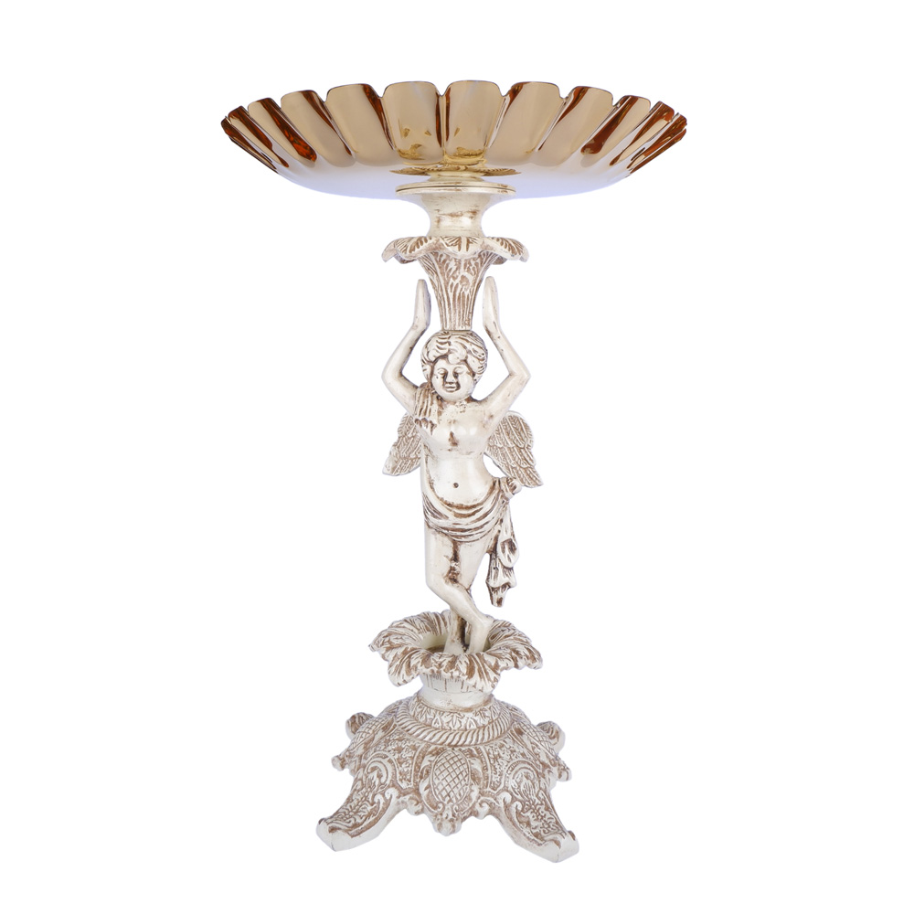 This enchanting decorative piece evokes a sense of timeless beauty, showcasing a finely detailed cherub or putto figure, sculpted in an ivory or distressed white finish. The tray itself is rendered in a complementary muted gold or champagne tone, with subtle distressing that highlights its ribbed, shell-like pattern, making it perfect for displaying small treasures, confections, or simply adding a decorative flourish. Ideal for adding a sophisticated and romantic touch to a vanity, console table, dessert buffet, or as a charming centerpiece.