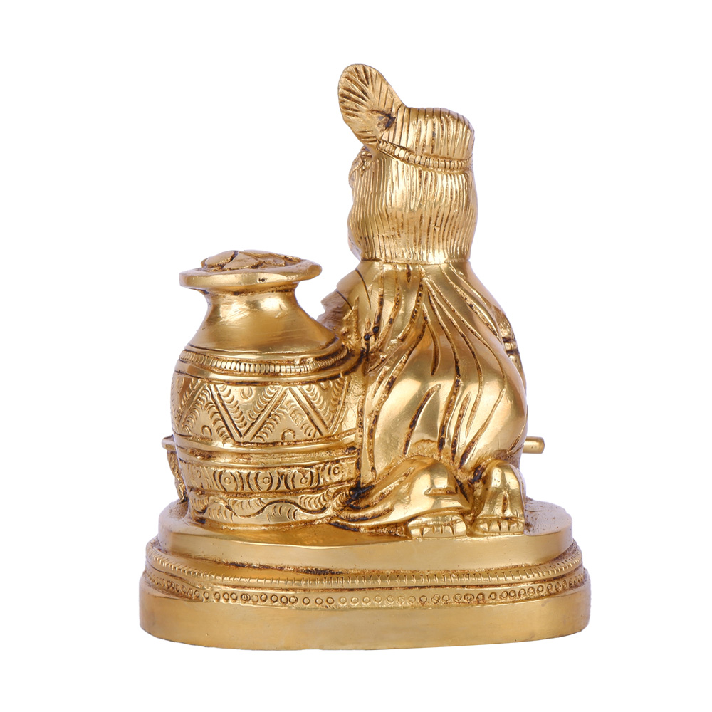This adorable brass idol depicts Laddu Gopal, also known as Baal Krishna (Child Krishna), in a charming and playful pose. Lord Krishna is shown seated with a laddu (sweet) in one hand and a pot of butter (matki) by his side, symbolizing his love for sweets and butter. The idol features intricate detailing on his ornaments, attire, and the decorative pot, all rendered in a beautiful gold finish. This heartwarming piece embodies innocence, joy, and prosperity, making it a perfect addition to your puja altar, a delightful decorative item for your home, or a wonderful gift that brings blessings and cheer.