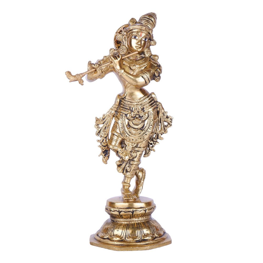 This elegant brass idol depicts Lord Krishna in his quintessential standing pose, gracefully playing his divine flute. Every detail, from his ornate crown and flowing garments to the intricate design of the flute, is meticulously crafted, showcasing fine artistry. The brass gold finish lends a timeless and revered aura to the idol, highlighting the subtle textures and contours. This piece embodies the enchanting and blissful presence of Krishna, making it a perfect spiritual addition to your home altar, a charming decorative accent, or a thoughtful gift that brings peace and auspiciousness to any space.