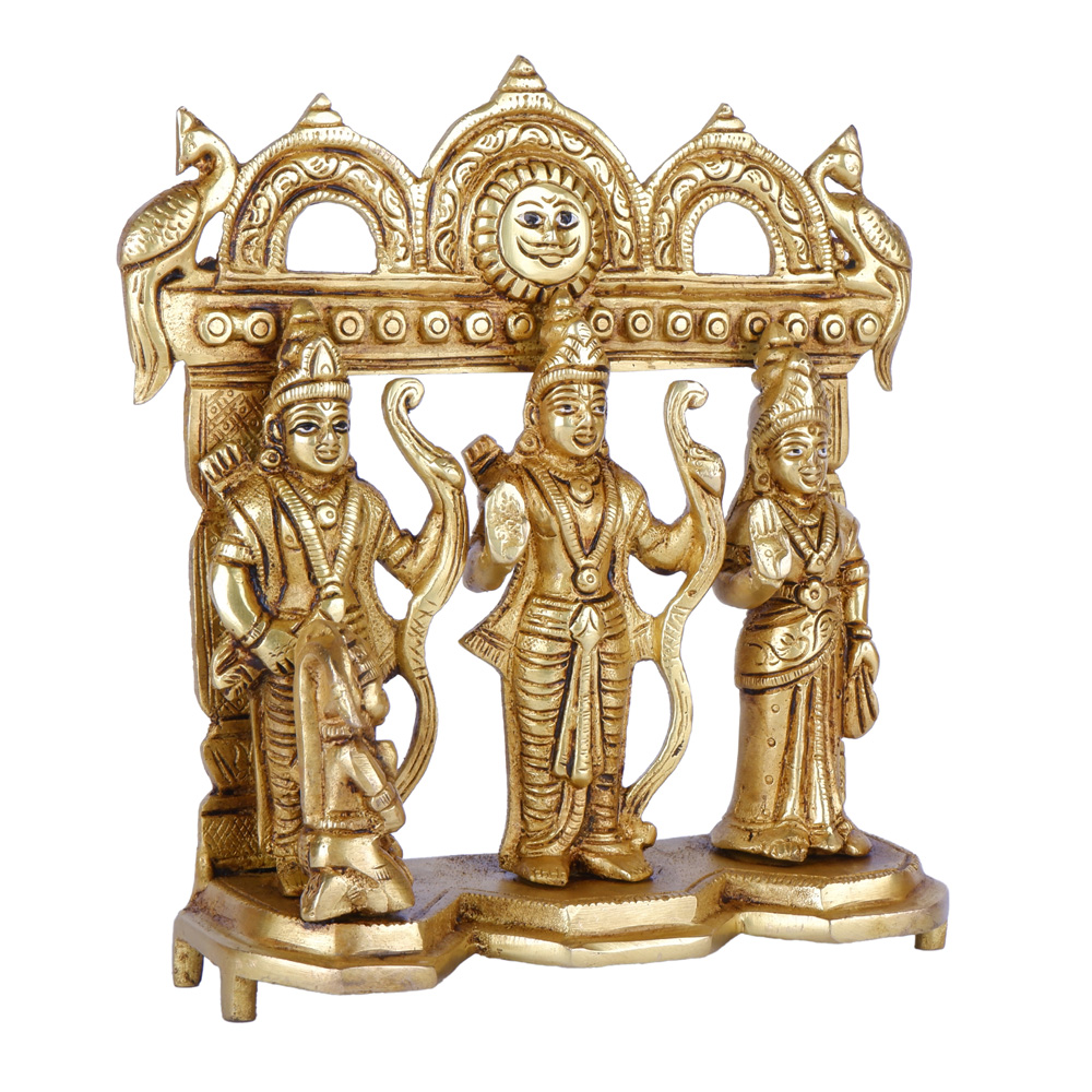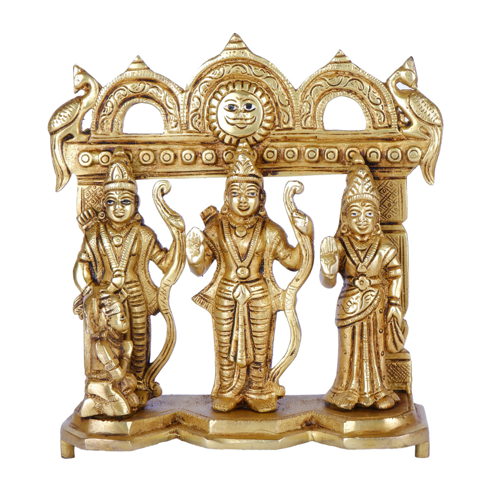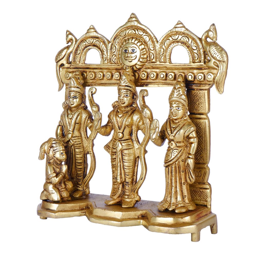Witness the sacred assembly of Lord Rama’s court in this brass creation, presenting the principal figures of the epic. Lord Rama stands centrally, accompanied by Goddess Sita, his loyal brother Lakshmana, and the devoted Hanuman, positioned humbly at their feet. Each figure is brought to life with applied hues on their raiment and crowns. An intricate, multi-tiered archway frames the deities, itself featuring fine details. This substantial piece, crafted from pure brass, displays a subtle shine on its unpainted sections. It serves as a profound symbol of righteousness, familial harmony, and unwavering devotion for any sacred space or cherished collection.