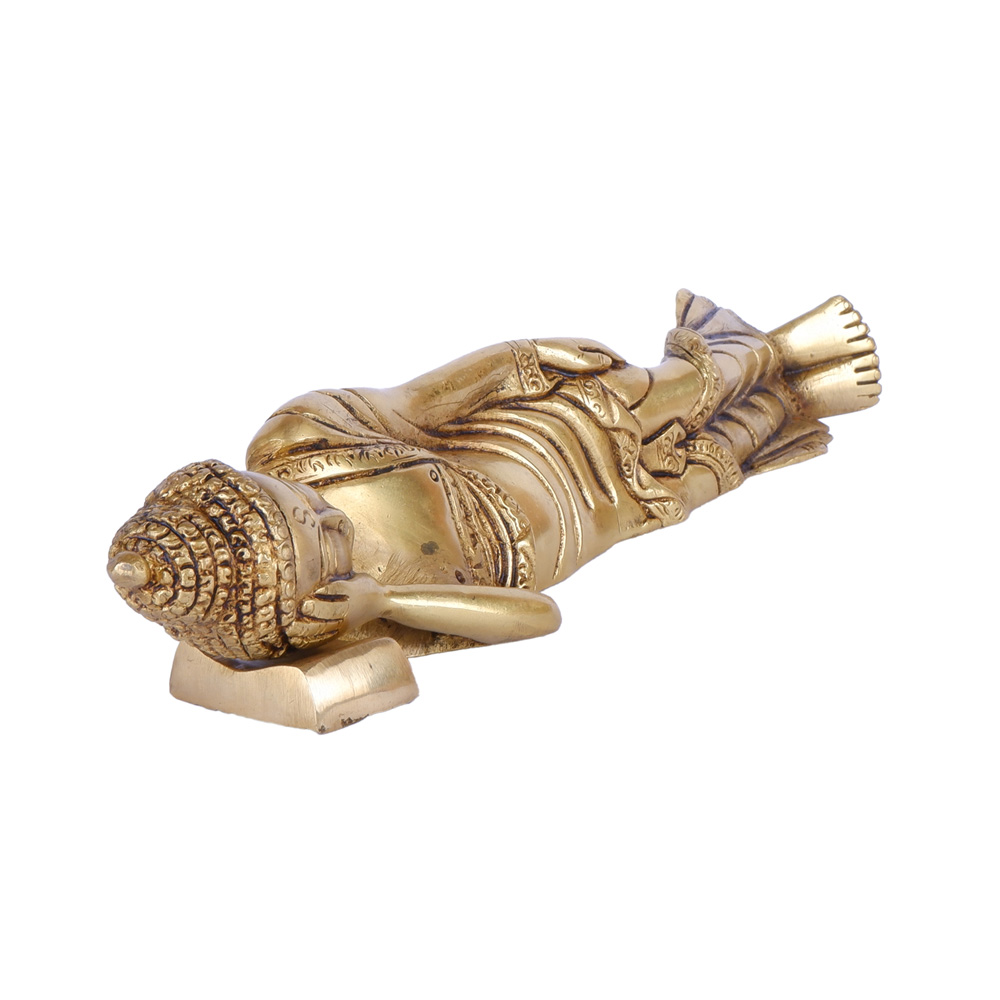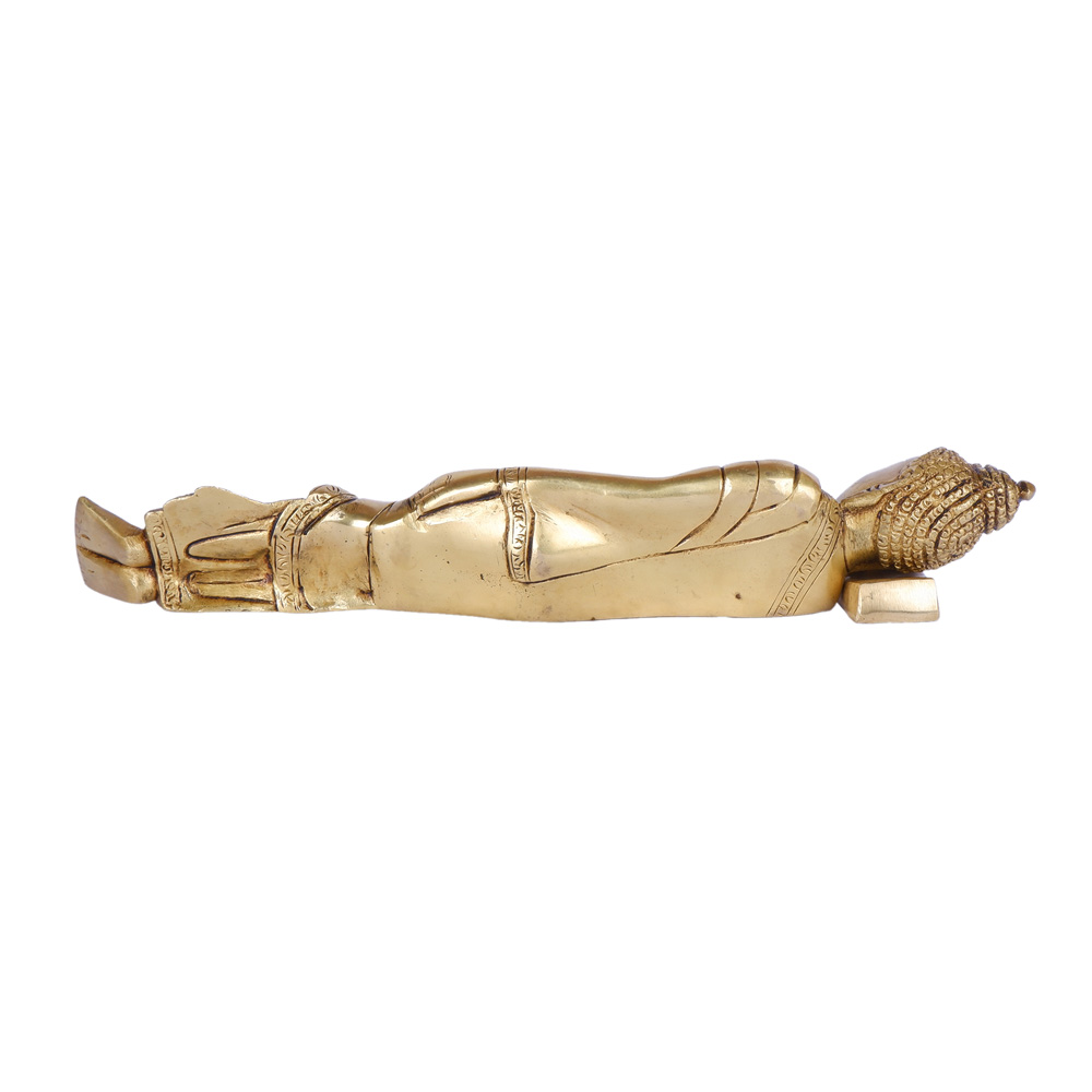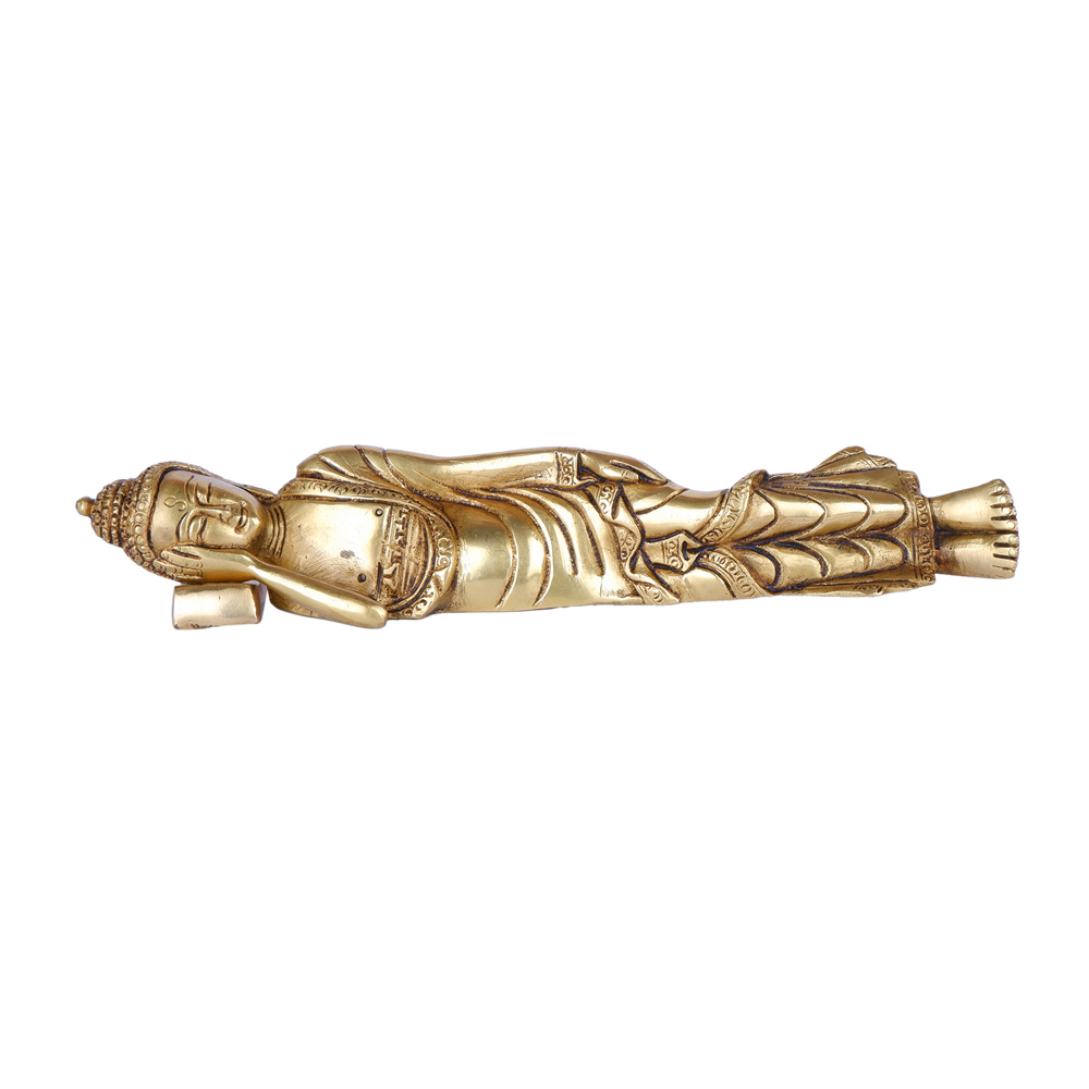 This serene brass idol portrays Lord Buddha in the classic reclining posture (Parinirvana Mudra), symbolizing his final moments before achieving nirvana, or the complete cessation of all suffering and desire. The idol is meticulously crafted to capture the peaceful expression and draped robes, with his head gently resting on his hand, conveying an ultimate state of tranquility and enlightenment. The elongated form and detailed features emphasize a sense of spiritual release and profound peace. This powerful piece serves as a timeless reminder of the path to inner peace and detachment, making it an ideal addition to a meditation space, a spiritual collection, or any area seeking a calming and reflective atmosphere.