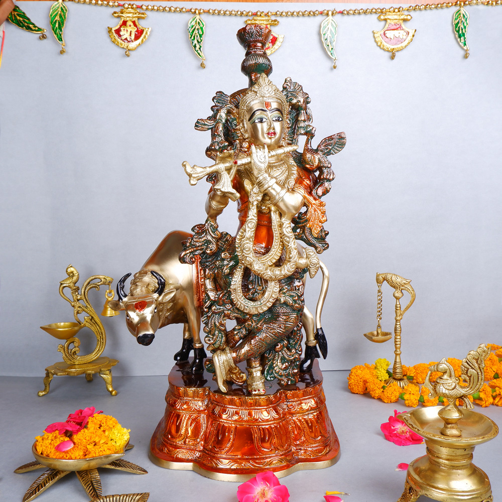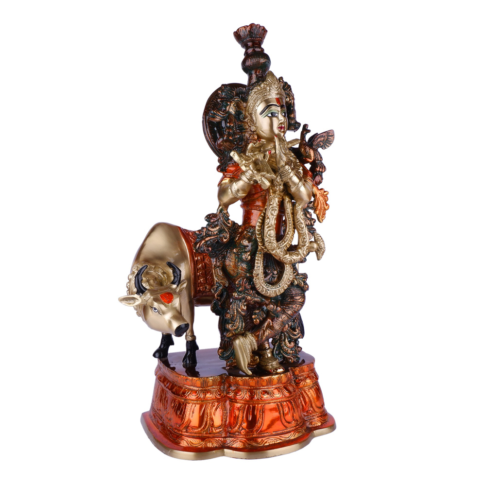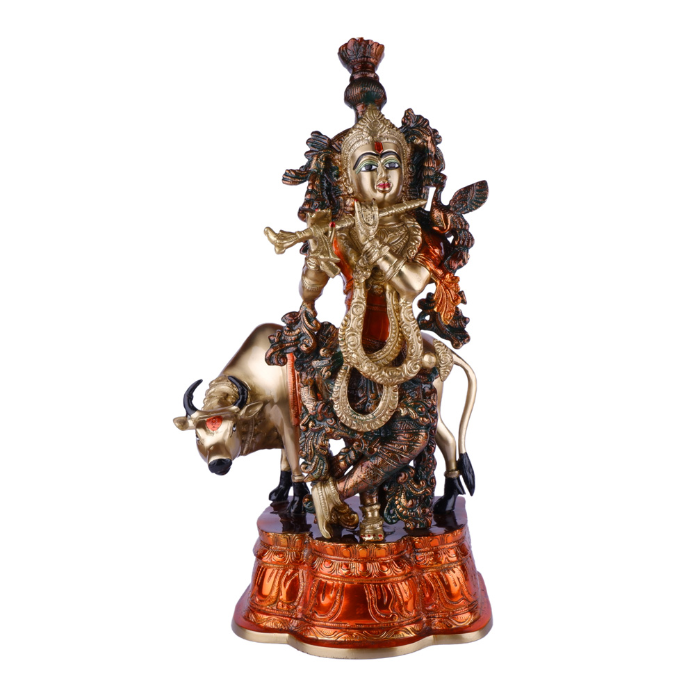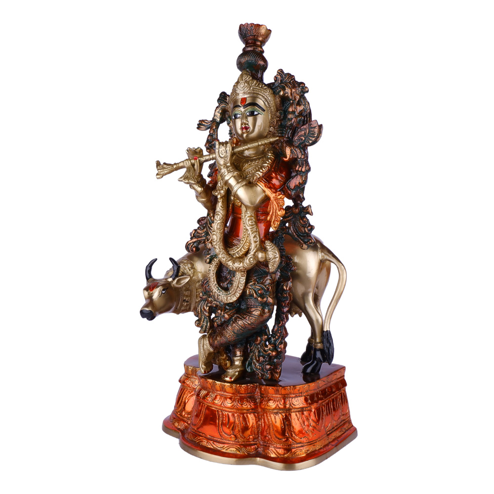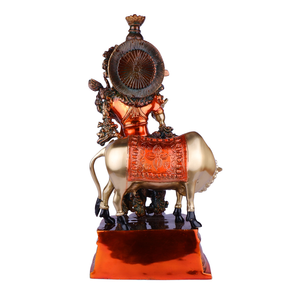 This striking brass idol features Lord Krishna, the divine flutist, standing gracefully atop a sacred cow. The idol boasts a unique dual-tone finish, combining the classic gold of Krishna and the cow with rich, burnished copper accents on the base and parts of the deity’s elaborate ornaments and foliage. This blend of colors, along with intricate detailing, creates a captivating piece that symbolizes prosperity, devotion, and the nurturing aspect of Krishna. It serves as a magnificent addition to any spiritual decor, a cherished collectible, or a distinctive gift.