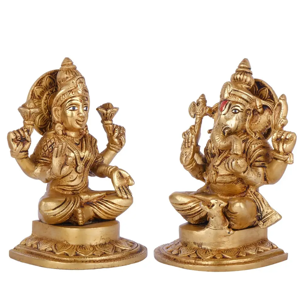 Celebrate the union of wealth and wisdom with this exquisitely crafted Brass Lakshmi–Ganesha Idol Set, a timeless pair that brings balance, harmony, and divine blessings into any space. These radiant idols beautifully embody the sacred energies of Goddess Lakshmi and Lord Ganesha, making them perfect for worship, festive rituals, or as a cherished gift of auspiciousness. Goddess Lakshmi is depicted in her graceful Padmasana (lotus pose), seated on a refined lotus-petal base, radiating prosperity and abundance. Her serene face, intricate crown, and flowing attire in a polished golden finish add elegance to her divine aura. She holds lotus flowers symbolizing purity and growth, while her mudras bestow blessings and prosperity. A delicate aureola frames her head, enhancing her sacred presence.