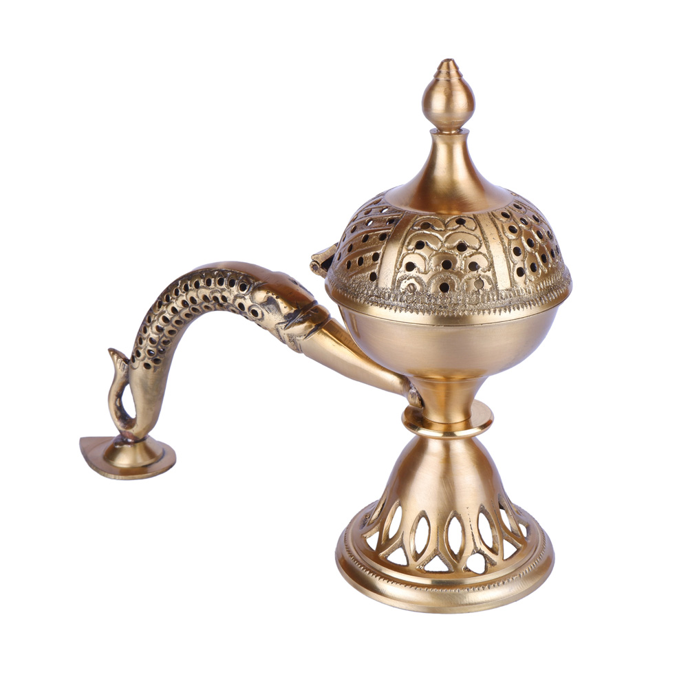 This traditional brass lobhan is designed for convenient and safe fumigation during rituals and pooja ceremonies. Featuring a beautifully perforated dome for controlled smoke release, it helps purify the surroundings with the soothing aroma of loban or incense. The extended curved handle ensures easy handling, even when hot, while the sturdy round base provides stability. Its classic design and smooth golden finish make it a perfect addition to temples, pooja rooms, or meditation spaces.
