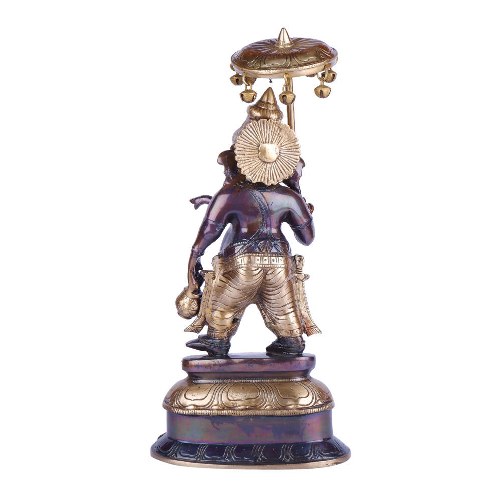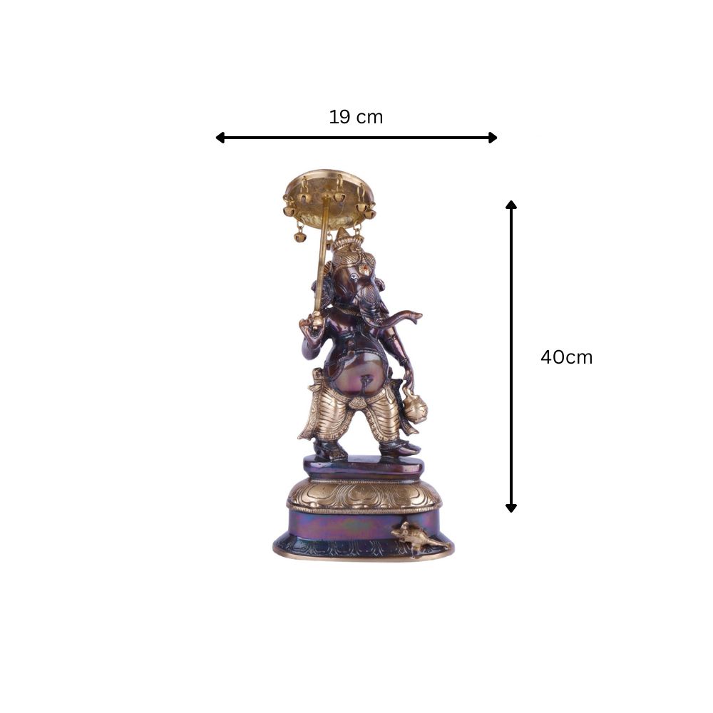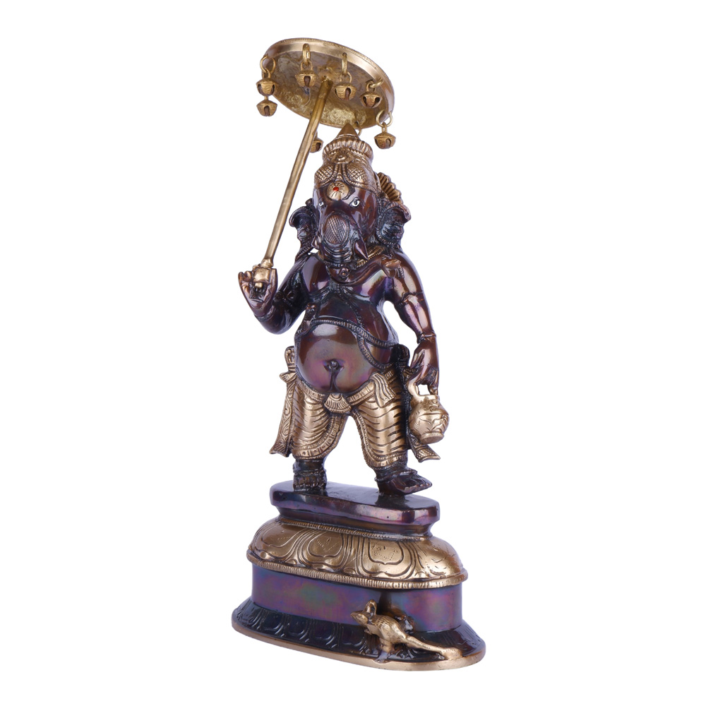 Commanding attention with its distinctive design, this majestic Lord Ganesha idol presents a unique blend of traditional reverence and artistic flair. Depicted in a standing posture, Ganesha is sheltered beneath a beautifully crafted, ornate umbrella or canopy, symbolizing his royal stature and protection. The idol features a striking finish, combining darker tones with gleaming golden accents that highlight intricate details on his attire, jewelry, and the base. His faithful mouse mount is charmingly positioned at his feet. This impressive piece serves as a powerful symbol of wisdom, prosperity, and divine shelter, making it a standout addition to any spiritual collection or sophisticated home decor.