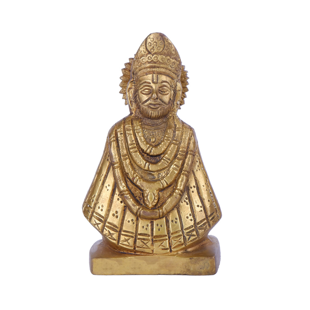 This reverent brass idol depicts Khatu Shyam Ji, a popular deity particularly worshipped in Rajasthan, often considered a manifestation of Lord Krishna or Barbarika. The idol features Khatu Shyam Ji in a traditional seated posture, adorned with a distinctive crown and elaborate garlands. His serene expression, along with the detailed depiction of his attire and features, captures the essence of his divine presence. Resting on a simple, sturdy base, this finely crafted piece radiates an aura of devotion and blessings. It is an ideal addition to a home altar, prayer room, or as a spiritual gift, inviting peace, prosperity, and fulfillment into your space.