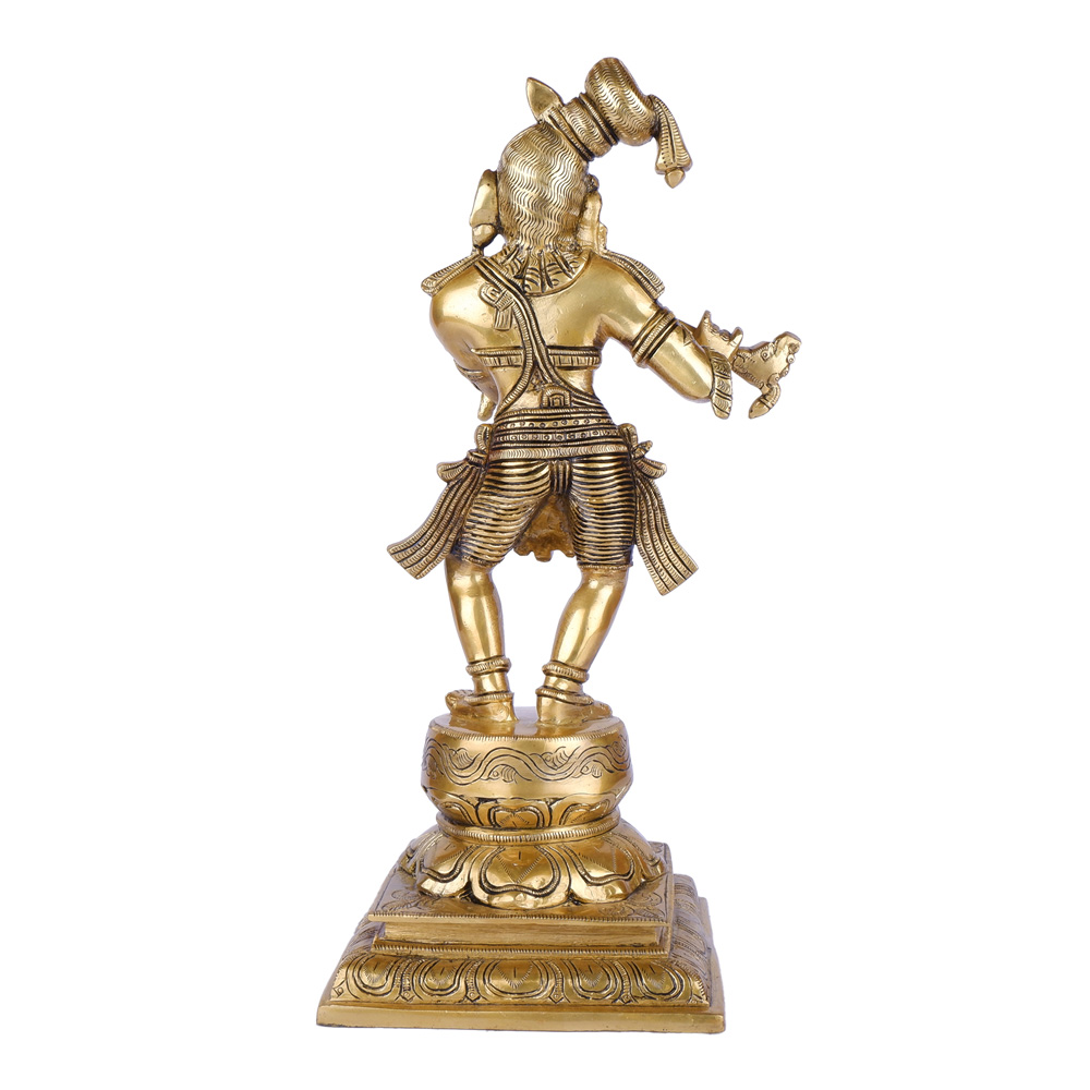 This captivating brass idol features Lord Krishna in a dynamic dancing pose, playing his divine flute, emanating joy and spiritual energy. The idol is exquisitely detailed with vibrant multi-color accents on Krishna’s attire and ornaments, bringing a lively and enchanting feel to the piece. Standing elegantly on a decorative, tiered base, this idol is a symbol of bliss, prosperity, and artistic beauty. It is an ideal addition to your spiritual space, a vibrant collectible, or a unique gift that embodies the playful and divine spirit of Krishna.