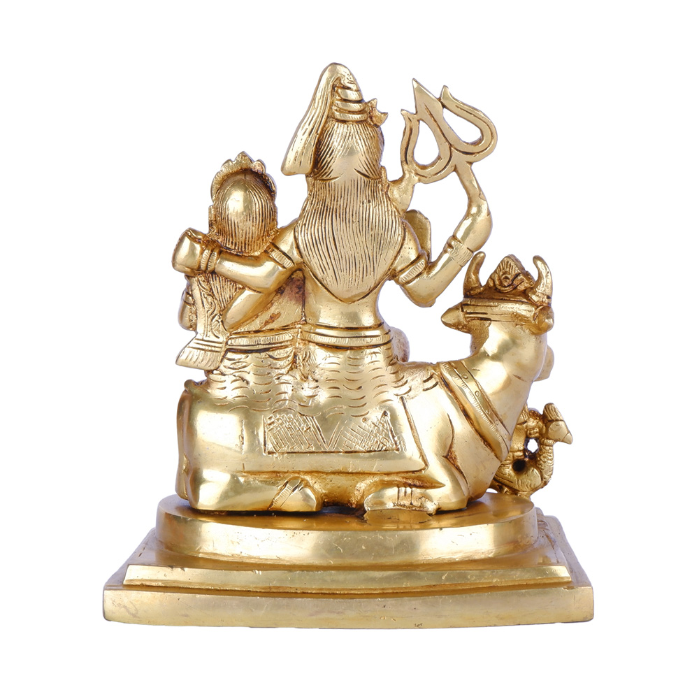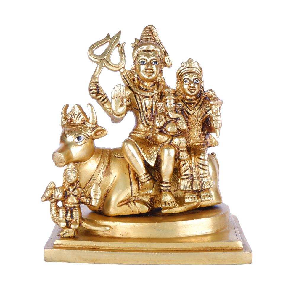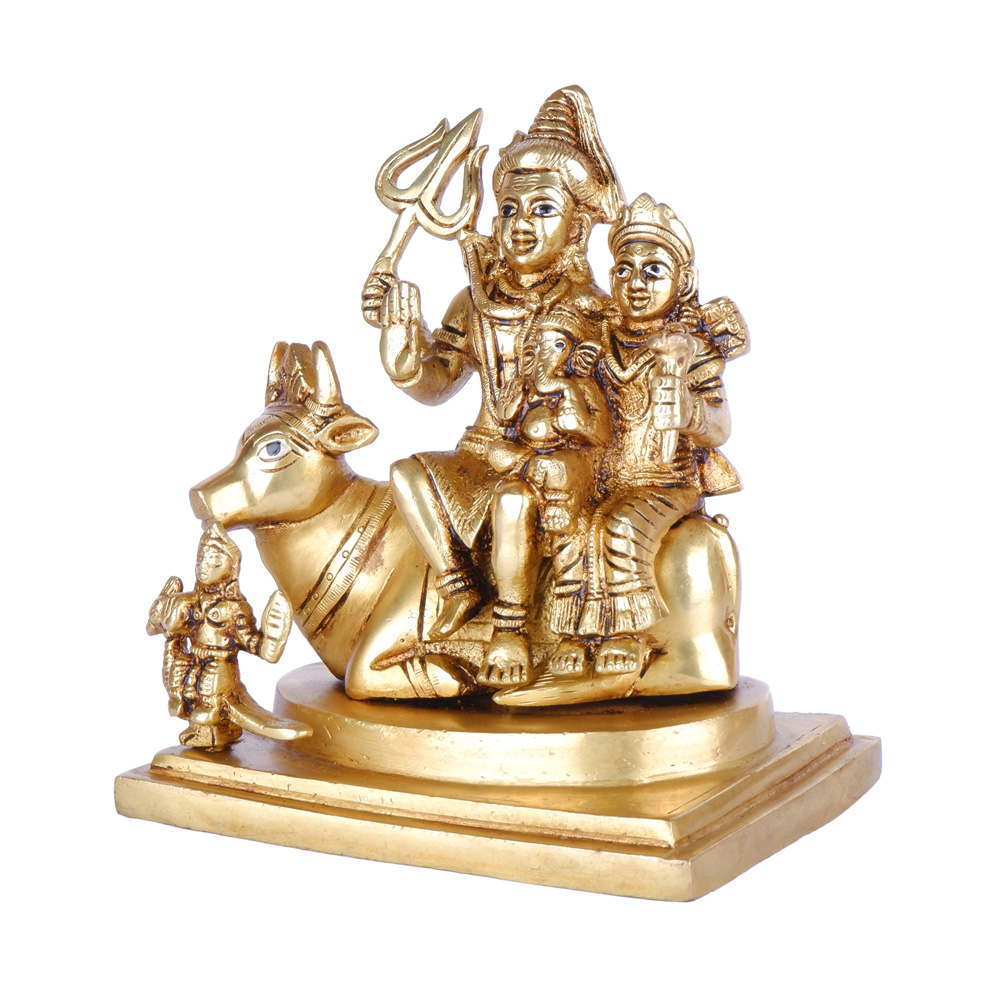 This finely crafted brass idol depicts Lord Shiva seated on the sacred bull Nandi, holding his iconic trishul, radiating strength and divinity. Beside Him sits Goddess Parvati, exuding grace and serenity, while a delicately carved Lord Ganesha stands near Nandi, adding an auspicious presence. The intricate detailing of the ornaments, facial expressions, and Nandi’s sculpted body reflects exceptional craftsmanship. The rich gold finish enhances its divine charm, making it an ideal addition to pooja rooms, spiritual spaces, or as a meaningful gift symbolizing protection, harmony, and prosperity.