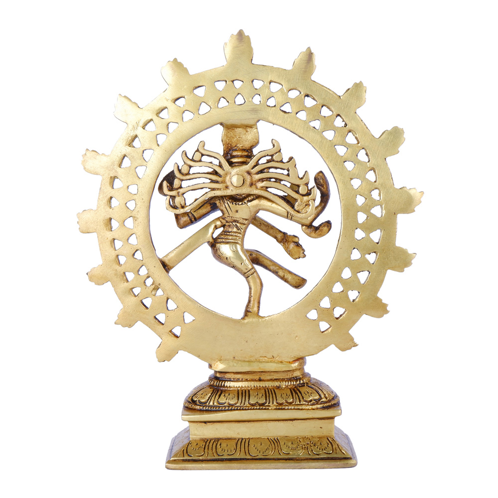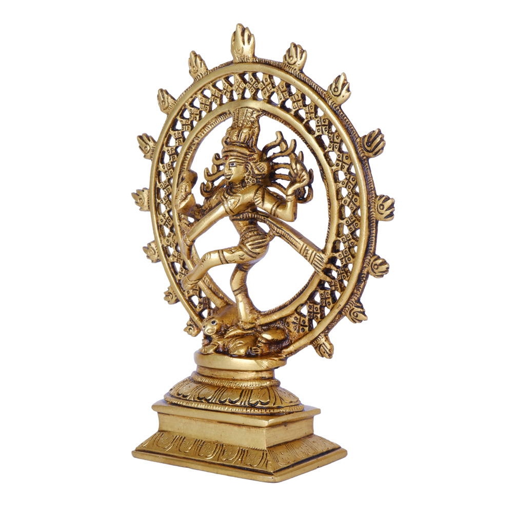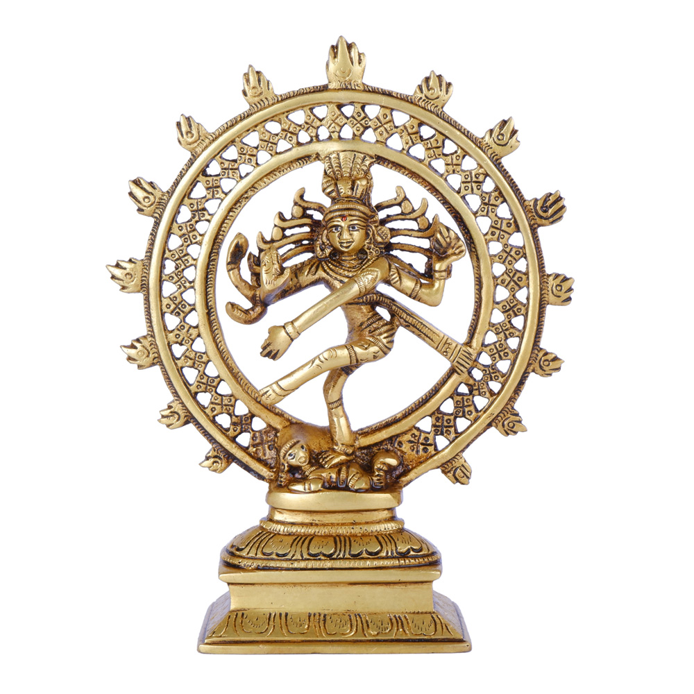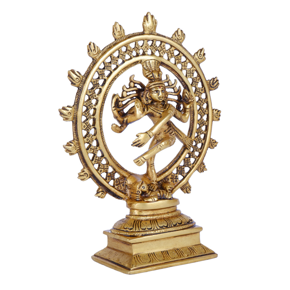 This magnificent brass idol depicts Nataraja, Lord Shiva in his cosmic dance (Ananda Tandava), symbolizing the cycle of creation, preservation, and dissolution. The idol captures the dynamic pose of Shiva, with one leg raised and his multiple arms gracefully positioned, each holding symbolic objects like the damaru (drum of creation) and fire (destruction). He is encapsulated within a flaming aureole (prabha mandala), representing the cosmos. The intricate details of his matted locks, ornaments, and the fierce yet serene expression are beautifully rendered. Standing on a multi-layered base, this finely crafted piece is a profound representation of cosmic energy, rhythm, and truth, making it an ideal centerpiece for any spiritual or artistic space.