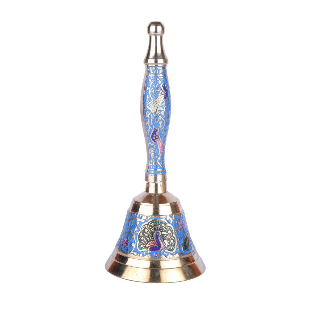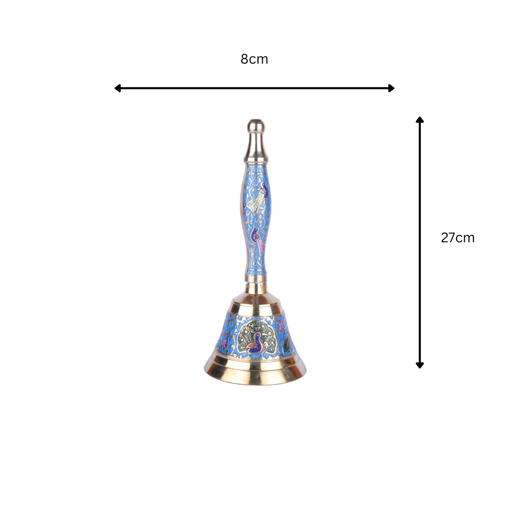 This exquisite temple bell is a beautiful fusion of traditional craftsmanship and vibrant artistry. Crafted from high-quality brass, its golden luster is elegantly complemented by intricate blue enamel work that adorns both the handle and the bell’s body. The design features delicate floral patterns and graceful peacock motifs, adding a touch of cultural richness and aesthetic appeal. When rung, it produces a clear, resonant chime, believed to purify the atmosphere and invite divine blessings during prayers and rituals. This hand bell is not only a functional item for your puja room or altar but also a stunning decorative piece that brings spiritual harmony and traditional Indian artistry into any home or sacred space. It makes for a thoughtful and cherished gift for devotees, collectors, or anyone appreciating fine craftsmanship.