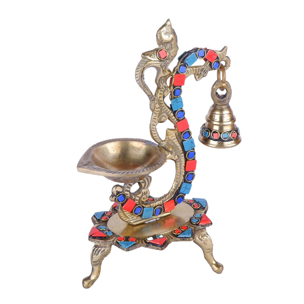 This elegant brass diya (oil lamp) combines functionality with traditional aesthetics, featuring a beautifully crafted single lamp holder alongside an ornate stand from which a small bell gracefully hangs. The entire piece is embellished with colorful stone or enamel work in blue, red, and gold tones, adding a vibrant and festive touch. The intricate design of the stand and base showcases traditional Indian artistry. This diya is perfect for daily prayers, festive occasions, or as a charming decorative accent, bringing both light and the auspicious sound of the bell to your home or sacred space.