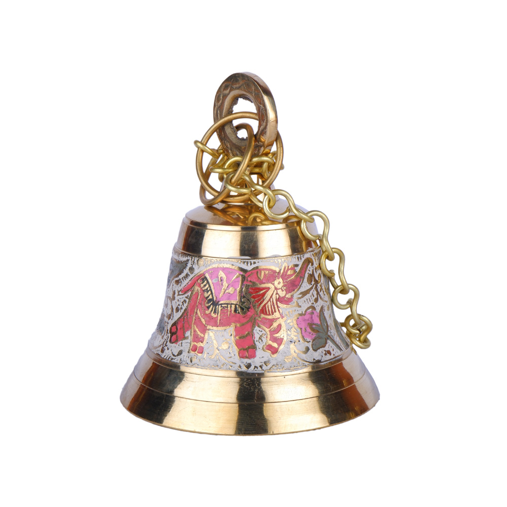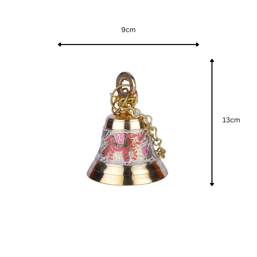 This charming brass hanging temple bell is a delightful blend of traditional artistry and spiritual symbolism. The bell features a radiant golden finish, beautifully contrasted by a central band adorned with intricate red and pink enamel work depicting majestic elephants, symbols of strength, wisdom, and good fortune. Delicately painted floral accents further enhance its visual appeal. The bell is equipped with a sturdy brass chain for easy hanging, allowing it to sway gently and produce a clear, melodious chime. Believed to purify the atmosphere and invite positive energies, this bell is perfect for your puja room, entrance, balcony, or any space where you wish to infuse a sense of serenity and traditional Indian elegance. It serves not only as a functional spiritual item but also as a unique and meaningful decorative piece, making it an ideal gift for housewarmings, festivals, or for those who appreciate cultural craftsmanship.
