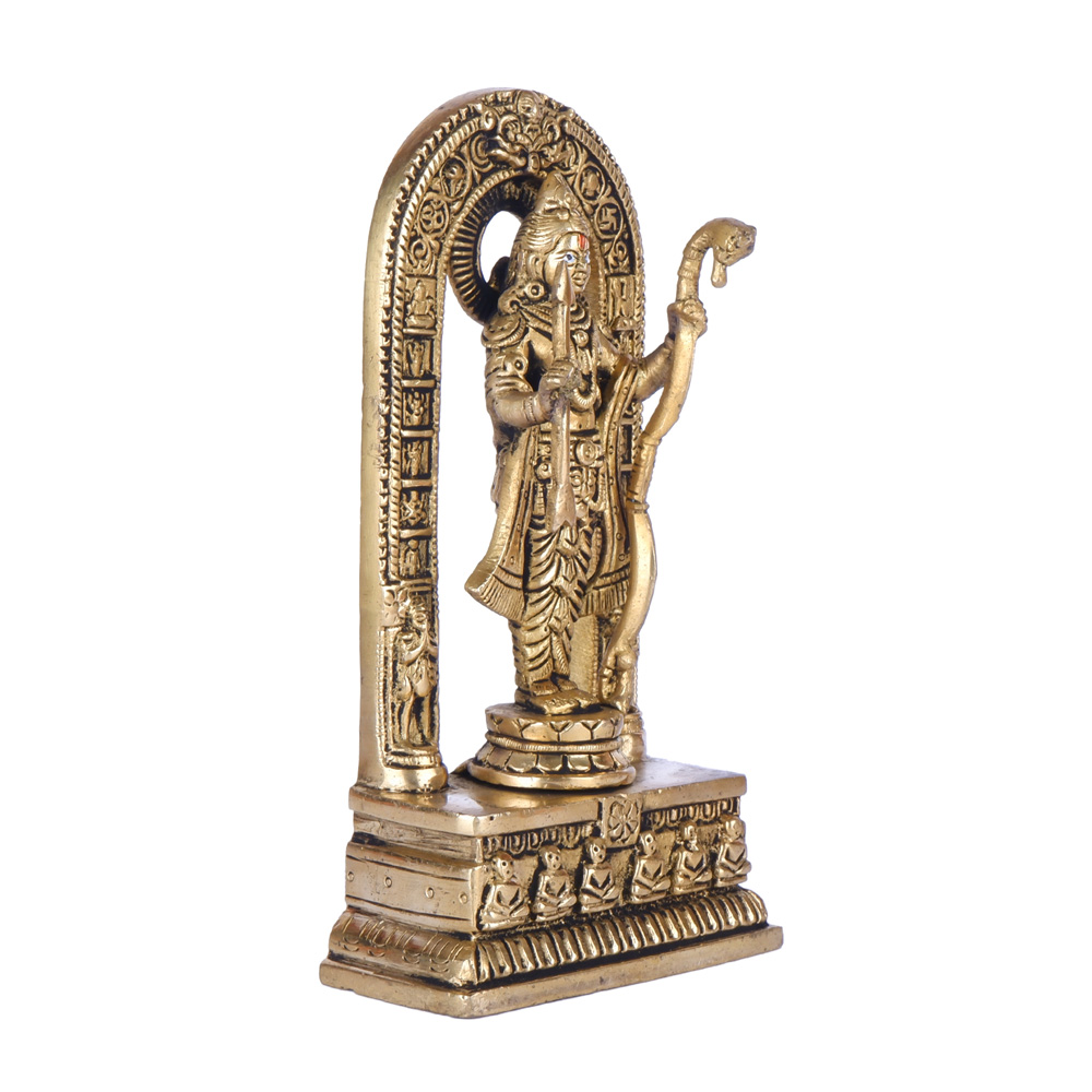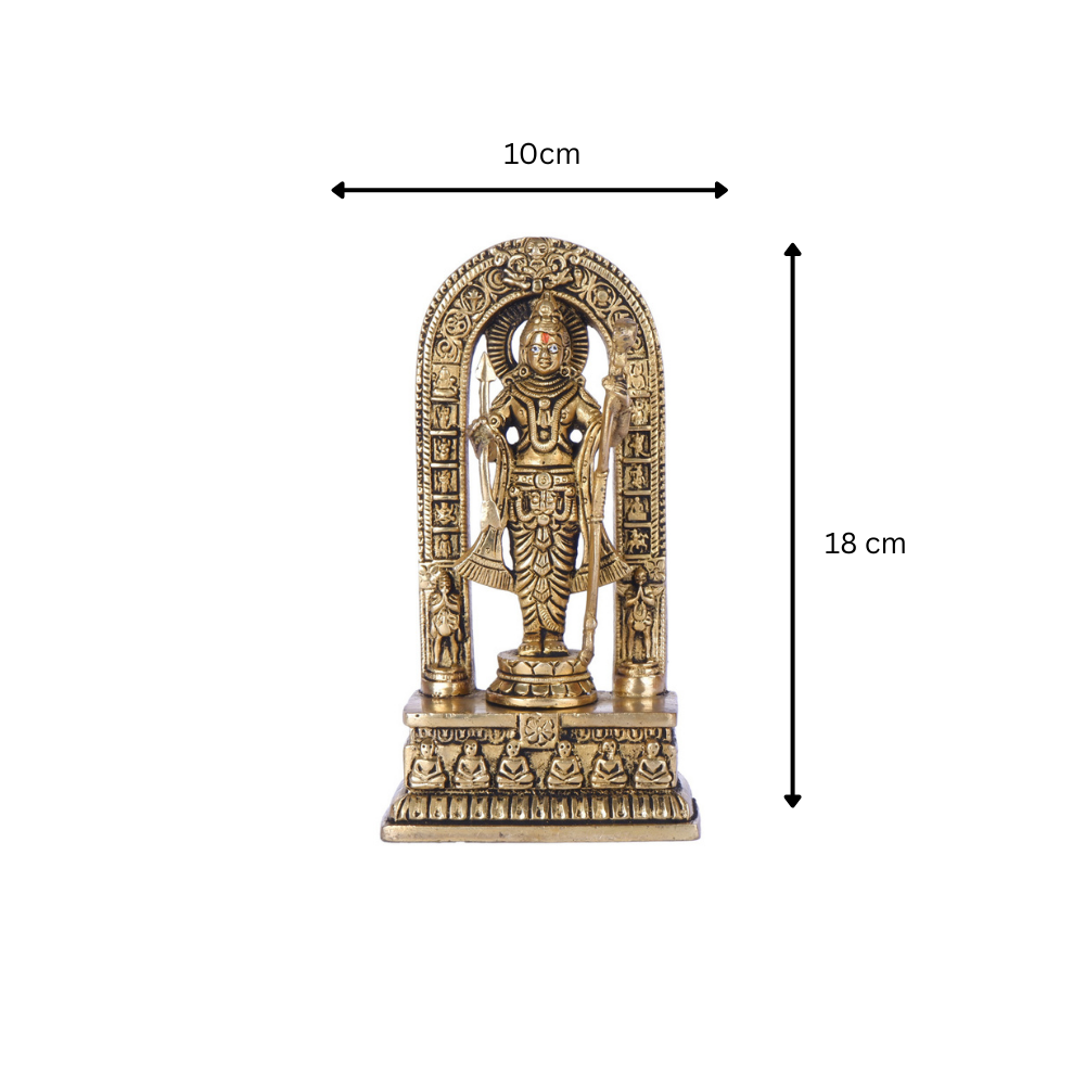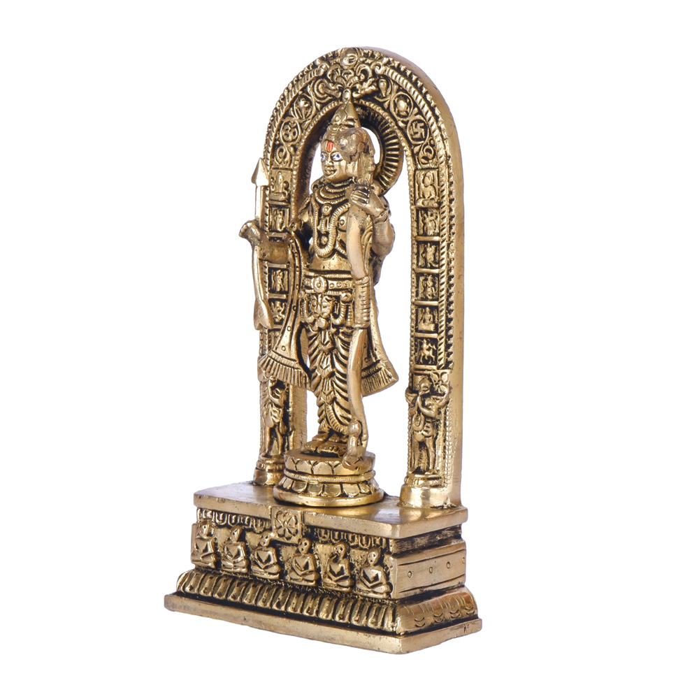 Gaze upon this imposing brass sculpture of Lord Rama, portrayed with dignity and poise within an elaborately embellished prabhavali (arch). This finely wrought piece depicts the Lord, symbolizing virtue and safeguarding, clearly holding His revered dhanush (bow). From His impressive crown and intricate adornments to His serene visage and the graceful drapes of His garments, every element showcases precision artistry. The magnificent arch boasts complex carvings, while the multi-tiered, robust pedestal is adorned with classic motifs, amplifying its dignified allure. Gleaming with an golden hue, this enduring and revered idol is superb for your spiritual space or home adornment, bestowing courage, righteousness, and profound spiritual benefits.