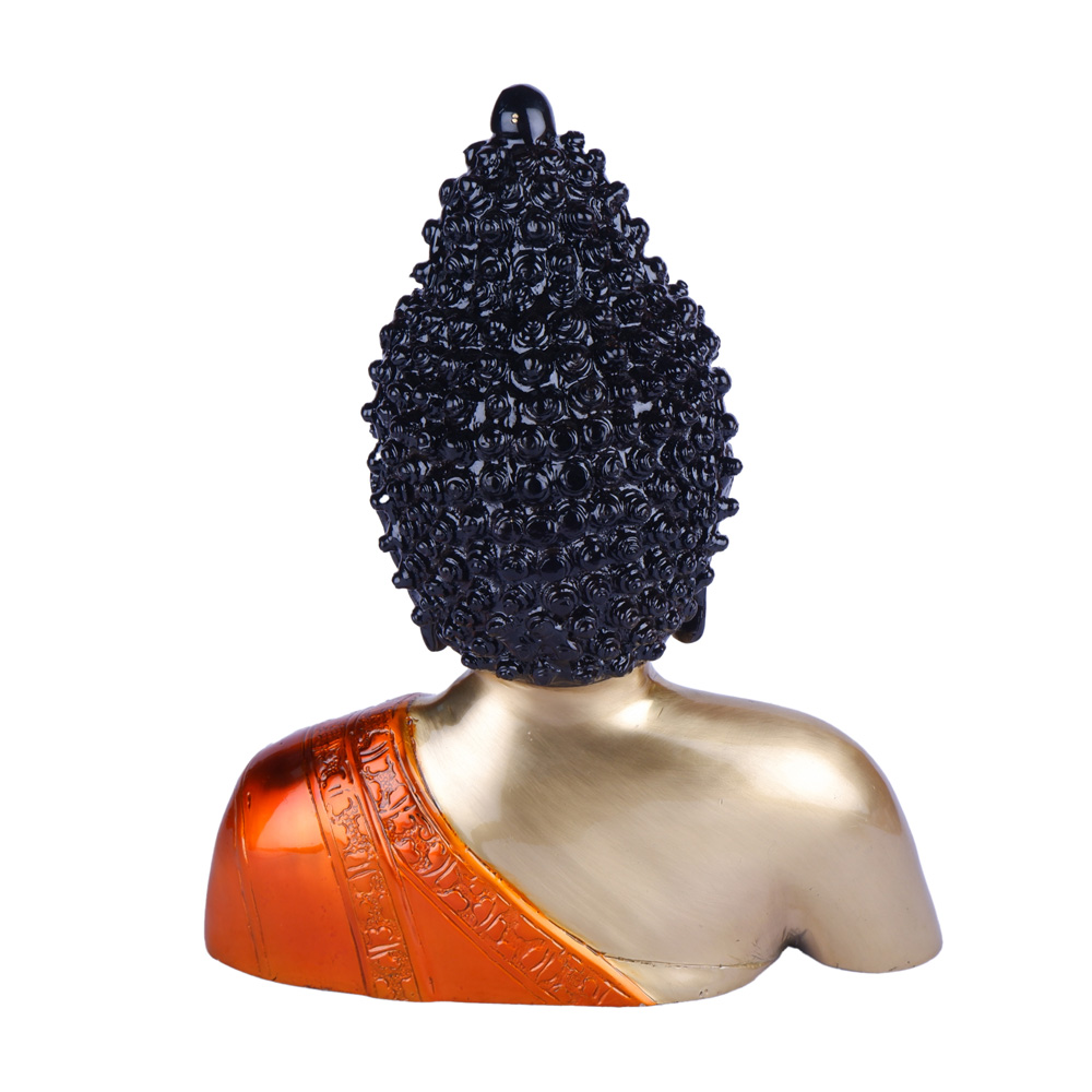 This serene and captivating bust portrays Lord Buddha in a state of tranquil contemplation, radiating peace and enlightenment. The sculpture beautifully combines materials, featuring a golden-finished torso and face, contrasting with the detailed black hair (ushnisha) and an elegantly draped, reddish-orange robe over one shoulder. The Buddha’s gentle facial features, including downcast eyes and a subtle smile, evoke a sense of calm and spiritual harmony. This meticulously crafted bust is an ideal addition to your meditation space, living room, or office, serving as a powerful symbol of inner peace, wisdom, and spiritual awakening. It’s not just a decorative piece but an embodiment of mindfulness and serenity, making it a perfect gift for those seeking tranquility in their surroundings.