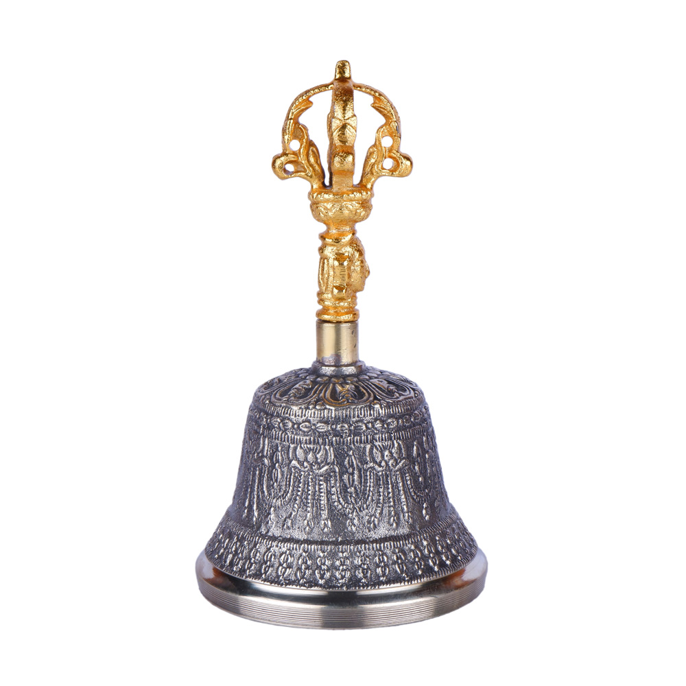 This unique and exquisitely crafted brass temple bell is crowned with a symbolic vajra (or dorje) handle, a revered ritual object representing firmness of spirit and spiritual power, particularly in Vajrayana Buddhism and some Hindu traditions. The bell itself features an ornate, textured body with intricate traditional motifs, showcasing exceptional craftsmanship. The entire piece is made from premium quality brass, boasting a beautiful two-tone finish – a lustrous golden top handle contrasting with a silver-toned base rim. When rung, it produces a clear, resonant, and deeply spiritual chime, believed to purify the environment, dissipate negative energies, and enhance focus during prayers, rituals, and meditation. This sacred bell is an essential instrument for spiritual practices, also serving as a magnificent decorative item that brings an aura of profound tranquility and cultural richness to your home, altar, or meditation space. It makes a truly distinguished and meaningful gift for spiritual practitioners and collectors.